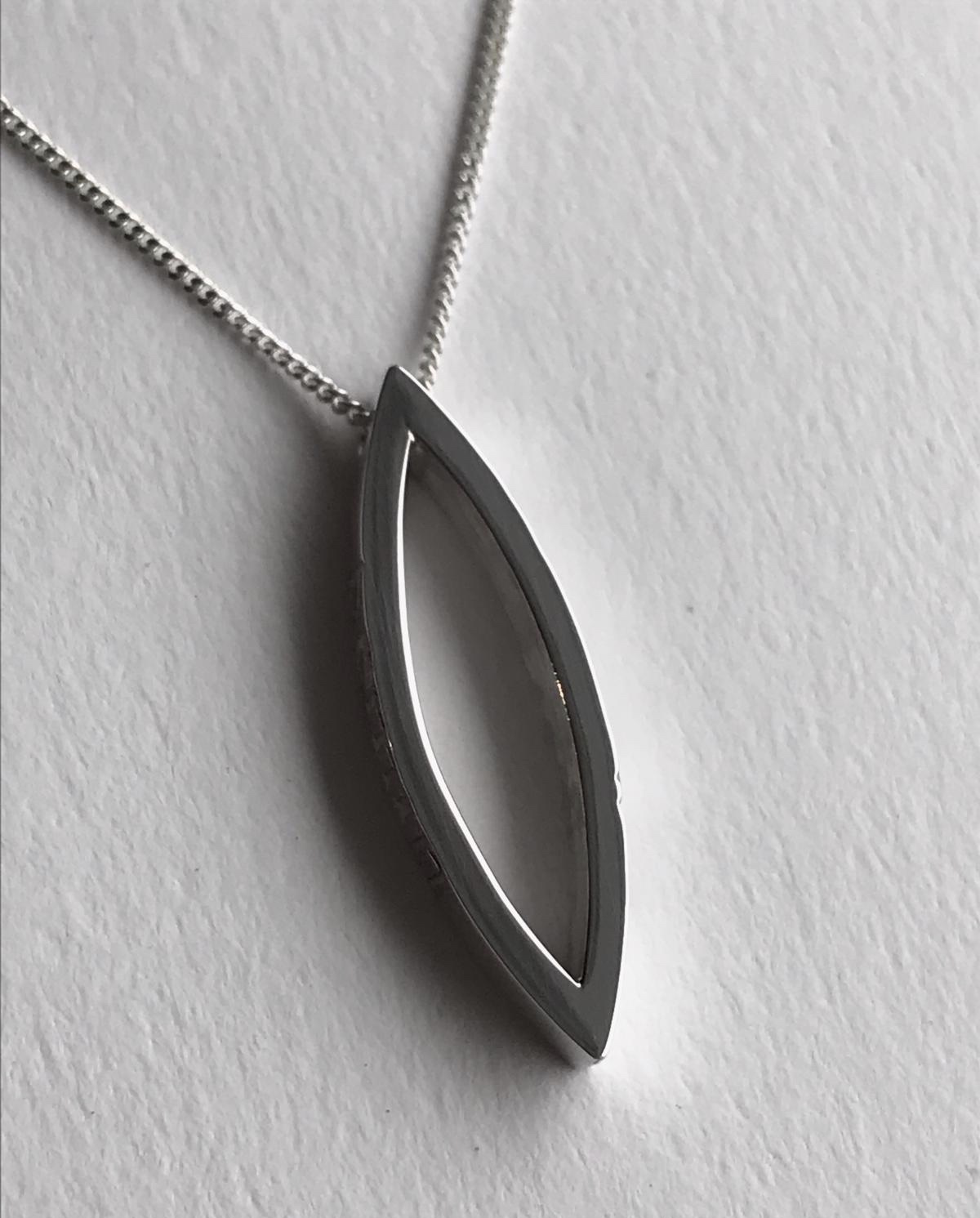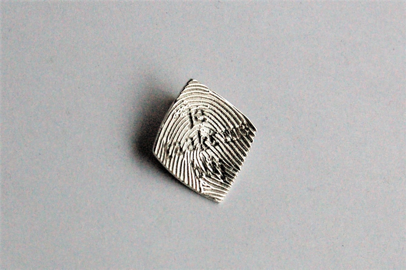 hanger van papier, zilver en epoxy | uitsnede uit dichtbundel | 11,5 x 18,5 mm | 75 euro
